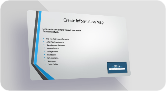 Create Information Map Let’s create one simple view of your entire financial picture. • Pre-Tax Retirement Accounts • After-Tax Investments • Bank Account Balances • Income Sources • College Funds • Real Estate • Life Insurance • Mortgages • Other Debts