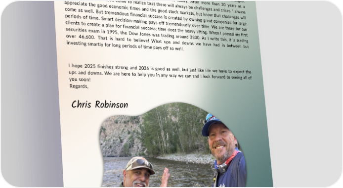 We have had an excellent year at RFG Wealth Advisory. We have a couple of new faces as well, with Michael Tull and Lanette Frost. I am looking forward to watching them help our team succeed. There are a lot of challenges, as usual, in the world and in our country; this never changes. There are also a lot of economic challenges we face today. After more than 30 years as a financial advisor, I have come to realize that there will always be challenges and crises. I always appreciate the good economic times and the good stock markets, but know that challenges will come as well. But tremendous financial success is created by owning great companies for large periods of time. Smart decision-making pays off tremendously over time. We are there for our clients to create a plan for financial success; time does the heavy lifting. When I passed my first securities exam in 1995, the Dow Jones was trading around 3800. As I write this, it is trading over 46,600. That is hard to believe! What ups and downs we have had in between but investing smartly for long periods of time pays off so well. I hope 2025 finishes strong and 2026 is good as well, but just like life we have to expect the ups and downs. We are here to help you in any way we can and I look forward to seeing all of you soon! Regards, Chris Robinson