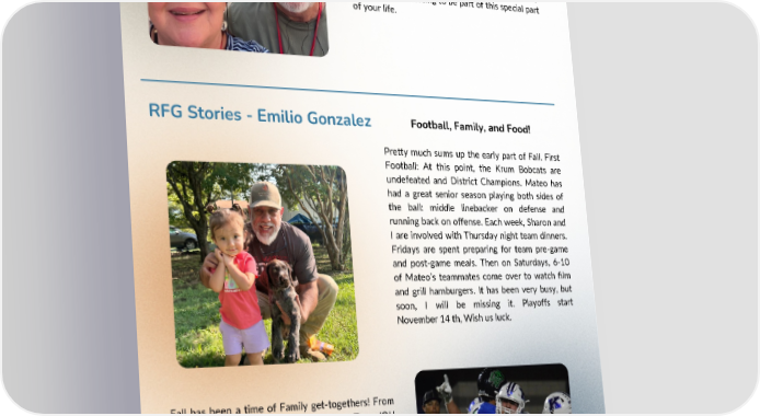 Pretty much sums up the early part of Fall. First Football: At this point, the Krum Bobcats are undefeated and District Champions. Mateo has had a great senior season playing both sides of the ball: middle linebacker on defense and running back on offense. Each week, Sharon and I are involved with Thursday night team dinners. Fridays are spent preparing for team pre-game and post-game meals. Then on Saturdays, 6-10 of Mateo’s teammates come over to watch film and grill hamburgers. It has been very busy, but soon, I will be missing it. Playoffs start November 14 th, Wish us luck. RFG Stories - Emilio Gonzalez Fall has been a time of Family get-togethers! From birthday parties, preseason rallies, Texas/OU games, and plain ‘ol Sunday afternoon grilling sessions, we have made fun memories in the “new” home and enjoyed every second of it. I'm so grateful to each of you for being part of RFG Wealth Advisory. We love serving you every day and count it a blessing to be part of this special part of your life. Football, Family, and Food!