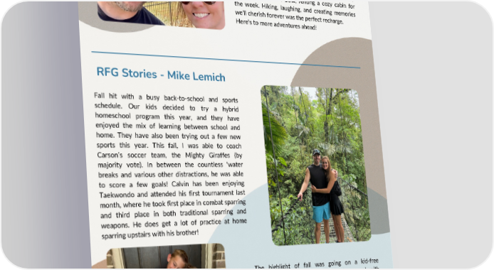 Fall hit with a busy back-to-school and sports schedule. Our kids decided to try a hybrid homeschool program this year, and they have enjoyed the mix of learning between school and home. They have also been trying out a few new sports this year. This fall, I was able to coach Carson’s soccer team, the Mighty Giraffes (by majority vote). In between the countless ‘water breaks and various other distractions, he was able to score a few goals! Calvin has been enjoying Taekwondo and attended his first tournament last month, where he took first place in combat sparring and third place in both traditional sparring and weapons. He does get a lot of practice at home sparring upstairs with his brother! The highlight of fall was going on a kid-free vacation with Sarah to Costa Rica for a week with two other couples. We went from the rainforest to the Arenal Volcano and finished at the beach. We were able to enjoy the diverse landscapes, food, and activities of the three regions. If you have never been, I highly recommend visiting it. My wife and I hit some big milestones on the home front: our 18th wedding anniversary and her 40th birthday! We celebrated in style with a family getaway to Broken Bow, renting a cozy cabin for the week. Hiking, laughing, and creating memories we'll cherish forever was the perfect recharge. Here's to more adventures ahead! RFG Stories - Mike Lemich