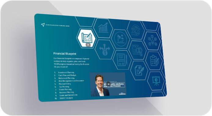 CLICK ON AN ICON TO REVEAL MORE Financial Blueprint Our Financial Blueprint encompasses 9 pivotal sections to help organize, plan, and track YOUR progress toward achieving the financial life you dream of. 1. Investment Planning 2. Cash Flow and Budget 3. Retirement Planning 4. Risk Management and Insurance 5. Planned Giving 6. Tax Planning 7. Estate Planning 8. Business Planning 9. Goals and Bucket Lists 10. S.W.O.T. Analysis