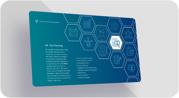 CLICK ON AN ICON TO REVEAL MORE 06. Tax Planning We provide an assessment of your tax situation and assist you in selecting a tax advisor if needed. We explore future tax strategies • Review and Analyze Tax Return such as Roth Conversions and • Review Cost Basis on Assets Qualified Charitable Distributions • Review Realized Gains and discuss how to avoid IRMAA • Tax Loss Harvesting additional premiums on your • Strategies for Carry Forward Losses Medicare insurance. We want to • Collaboration with Tax Professional know if you are taking the standard deduction or itemizing on your tax • IRMAA Review return as well as if you have any tax • Roth Conversation loss carry forwards or any large tax • Itemization Strategies liability coming due.