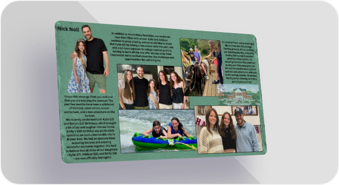Nick Noll In addition to the birthday festivities, our weekends On another front, we're starting to have been filled with soccer. Kylie and Addison dip our toes into the college- continue to enjoy playing, and we are thrilled to share hunting process. It's an exciting that Kylie will be joining a new soccer club this year, one yet daunting journey, and we're with a lot more exposure to college coaches as she is making the rounds to explore looking to build off the one offer she has so far from potential future paths. It's Concordia!! We're excited about the new challenges and amazing how time flies and how opportunities this will bring her. quickly our little ones grow up! We look forward to sharing more updates and adventures with you in the coming months. As always, thank you for allowing us to be a part of your journey! I hope this message finds you well and that you are enjoying the summer! The past few months have been a whirlwind of birthday celebrations, soccer excitement, and a new adventure on the horizon. We recently celebrated both Kylie (17) and Emily's (13) birthdays, which brought a lot of joy and laughter into our home. Emily's 13th birthday was particularly special as we took a memorable trip to Broken Bow. We had an absolute blast exploring the area and creating wonderful memories together. It's hard to believe that all three of our daughters —Kylie (17), Addison (15), and Emily (13) —are now officially teenagers!