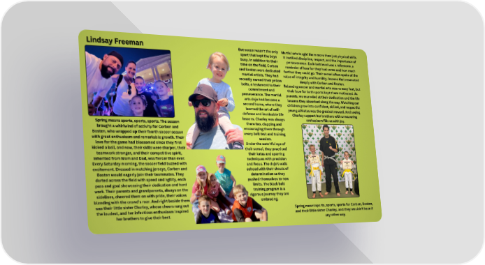 But soccer wasn't the only Martial arts taught them more than just physical skills. Lindsay Freeman Lindsay Freeman sport that kept the boys It instilled discipline, respect, and the importance of busy. In addition to their perseverance. Each belt level was a milestone, a time on the field, Corben reminder of how far they had come and how much and Bosten were dedicated further they could go. Their sensei often spoke of the martial artists. They had value of integrity and humility, lessons that resonated recently earned their yellow deeply with Corben and Bosten. belts, a testament to their Balancing soccer and martial arts was no easy feat, but commitment and their love for both sports kept them motivated. As perseverance. The martial parents, we marveled at their dedication and the life arts dojo had become a lessons they absorbed along the way. Watching our second home, where they children grow into confident, skilled, and respectful learned the art of self- young athletes was the greatest reward. And seeing defense and invaluable life Charley support her brothers with unwavering lessons. Charley was always enthusiasm fills us with joy. Spring means sports, sports, sports. The season there too, clapping and brought a whirlwind of activity for Corben and encouraging them through Bosten, who wrapped up their fourth soccer season every belt test and training with great enthusiasm and remarkable growth. Their session. love for the game had blossomed since they first Under the watchful eye of kicked a ball, and now, their skills were sharper, their their sensei, they practiced teamwork stronger, and their competitive spirit, their katas and sparring inherited from Mom and Dad, was fiercer than ever. techniques with precision Every Saturday morning, the soccer field buzzed with and focus. The dojo's walls excitement. Dressed in matching jerseys, Corben and echoed with their shouts of Bosten would eagerly join their teammates. They determination as they darted across the field with speed and agility, each pushed themselves to new pass and goal showcasing their dedication and hard limits. The black belt work. Their parents and grandparents, always on the training program is a sidelines, cheered them on with pride, their voices rigorous journey they are blending with the crowd's roar. And right beside them embracing. was their little sister Charley, whose cheers rang out Spring meant sports, sports, sports for Corben, Bosten, the loudest, and her infectious enthusiasm inspired and their little sister Charley, and they wouldn't have it her brothers to give their best. any other way.