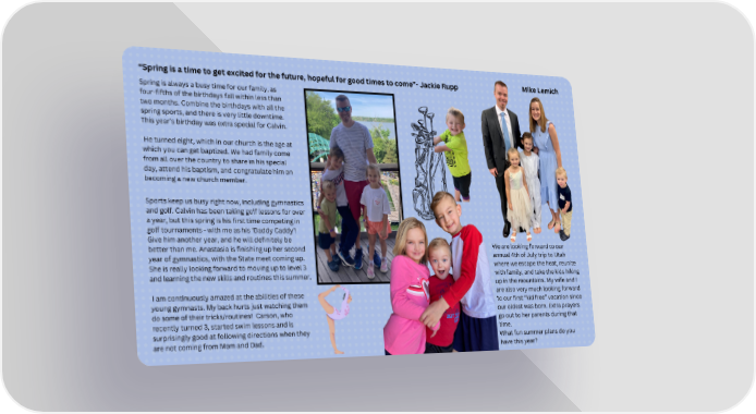 Mike Lemich “Spring is a time to get excited for the future, hopeful for good times to come”- Jackie Rupp Spring is always a busy time for our family, as four-fifths of the birthdays fall within less than two months. Combine the birthdays with all the spring sports, and there is very little downtime. This year’s birthday was extra special for Calvin. He turned eight, which in our church is the age at which you can get baptized. We had family come from all over the country to share in his special day, attend his baptism, and congratulate him on becoming a new church member. Sports keep us busy right now, including gymnastics and golf. Calvin has been taking golf lessons for over a year, but this spring is his first time competing in golf tournaments - with me as his ‘Daddy Caddy’! Give him another year, and he will definitely be We are looking forward to our better than me. Anastasia is finishing up her second annual 4th of July trip to Utah year of gymnastics, with the State meet coming up. where we escape the heat, reunite She is really looking forward to moving up to level 3 with family, and take the kids hiking and learning the new skills and routines this summer. up in the mountains. My wife and I are also very much looking forward I am continuously amazed at the abilities of these to our first “kid free” vacation since young gymnasts. My back hurts just watching them our oldest was born. Extra prayers do some of their tricks/routines! Carson, who go out to her parents during that recently turned 3, started swim lessons and is time. surprisingly good at following directions when they What fun summer plans do you are not coming from Mom and Dad. have this year?