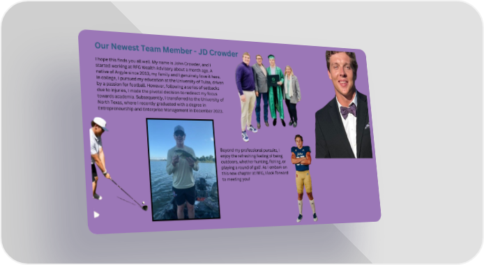 Our Newest Team Member - JD Crowder I hope this finds you all well. My name is John Crowder, and I started working at RFG Wealth Advisory about a month ago. A native of Argyle since 2013, my family and I genuinely love it here. In college, I pursued my education at the University of Tulsa, driven by a passion for football. However, following a series of setbacks due to injuries, I made the pivotal decision to redirect my focus towards academia. Subsequently, I transferred to the University of North Texas, where I recently graduated with a degree in Entrepreneurship and Enterprise Management in December 2023. Beyond my professional pursuits, I enjoy the refreshing feeling of being outdoors, whether hunting, fishing, or playing a round of golf. As I embark on this new chapter at RFG, I look forward to meeting you!