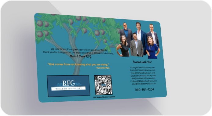 We look forward to a great year with you and your family. Thank you for being part of the experience that is RFG Wealth Advisory. Chris & Team RFG Connect with Us! “Risk comes from not knowing what you are doing.” [email protected] Warren Buffett [email protected] [email protected] [email protected] [email protected] [email protected] [email protected] 940-464-4104 RFG Wealth Advisory Blueprint
