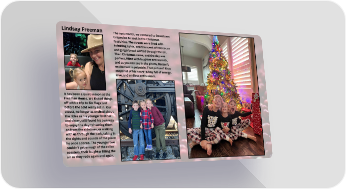 Lindsay Freeman Lindsay Freeman The next month, we ventured to Downtown Grapevine to soak in the Christmas festivities. The streets were lined with twinkling lights, and the scent of hot cocoa and gingerbread wafted through the air. Then Christmas came, and the day was perfect, filled with laughter and warmth, and as you can see in the photo, Bosten’s excitement is palpable. That picture? It’s a snapshot of his heart—a boy full of energy, love, and endless enthusiasm. It has been a quiet season at the Freeman House. We kicked things off with a trip to Six Flags just before the cold really set in. Our oldest, no longer as excited about the rides as his younger brother and sister, still found his own way to enjoy the day—cheering them on from the sidelines, or walking with us through the park, taking in the sights and sounds of the place he once adored. The younger two couldn’t get enough of the roller coasters, their laughter filling the air as they rode again and again.