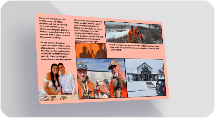 Of course, the winter season would During this commotion of the not be complete without a bit of holiday season, my oldest quail hunting sprinkled in from daughter, Isabella, got married. time to time. When you can have a We traveled to OKC for the quail hunt in West Texas with a ceremony and enjoyed getting to dusting of snow on the ground, know our expanding family. Now I some good dogs, a best friend, and have two sons-in-law to console!!! a whiskey toast at the Combine Then comes Christmas. Cantina, you are living right! Cherish your family and friends. I recently read a book by Nate Ebner We had a simple Christmas called Finish Strong. In that book, he mentioned the best way to spell celebration by the fireplace with LOVE is T.I.M.E. gifts and games. It felt somewhat like a Norman Rockwell painting mixed with a Ernest Hemingway cocktail!. There's nothing like having the entire family together!