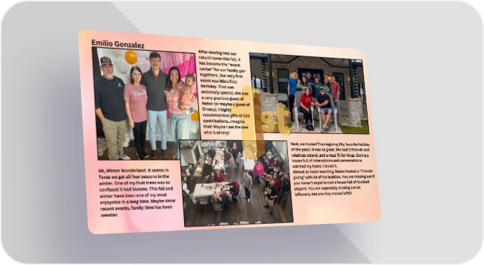 Emilio Gonzalez After moving into our rebuilt home this fall, it has become the "event center" for our family get- togethers. Our very first event was Mia's first birthday. That was extremely special; she was a very gracious guest of honor (or maybe a guest of Ornery). I highly recommended gifts of 529 contributions…imagine that! Maybe I am the one who is ornery! Next, we hosted Thanksgiving (My favorite holiday of the year). It was so great. We had 27 friends and relatives attend, and a meal fit for kings. Seeing a house full of interactions and conversations warmed my heart. I loved it. Ah, Winter Wonderland. It seems in Almost as heart-warming, Mateo hosted a "Friends- Texas we get all four seasons in the giving" with 16 of his buddies. You are missing out if winter. One of my fruit trees was so you haven't experienced a house full of football confused it had blooms. This fall and players. You are especially missing out on winter have been one of my most leftovers; not one tiny morsel left!!! enjoyable in a long time. Maybe since recent events, family time has been sweeter.