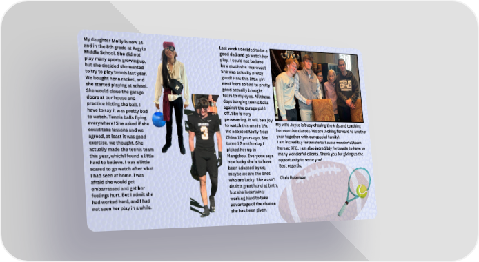 My daughter Molly is now 14 Last week I decided to be a and in the 8th grade at Argyle good dad and go watch her Middle School. She did not play. I could not believe play many sports growing up, how much she improved! but she decided she wanted She was actually pretty to try to play tennis last year. good! How this little girl We bought her a racket, and went from so bad to pretty she started playing at school. good actually brought She would close the garage tears to my eyes. All those doors at our house and days banging tennis balls practice hitting the ball. I against the garage paid have to say it was pretty bad off. She is very to watch. Tennis balls flying persevering. It will be a joy My wife Joyce is busy chasing the kids and teaching everywhere! She asked if she to watch this one in life. her exercise classes. We are looking forward to another could take lessons and we We adopted Molly from year together with our special family! agreed, at least it was good China 12 years ago. She I am incredibly fortunate to have a wonderful team exercise, we thought. She turned 2 on the day I here at RFG. I am also incredibly fortunate to have so actually made the tennis team picked her up in many wonderful clients. Thank you for giving us the this year, which I found a little Hangzhou. Everyone says opportunity to serve you! hard to believe. I was a little how lucky she is to have Best regards, scared to go watch after what been adopted by us; I had seen at home. I was maybe we are the ones Chris Robinson afraid she would get who are lucky. She wasn’t embarrassed and get her dealt a great hand at birth, feelings hurt. But I admit she but she is certainly had worked hard, and I had working hard to take not seen her play in a while. advantage of the chance she has been given.