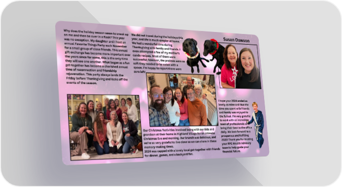 Susan Dawson Why does the holiday season seem to sneak up We did not travel during the holidays this on me and then be over in a flash? This year year, and life is much simpler at home. was no exception. My daughter and I host an We had a wonderful time during annual Favorite Things Party each November Thanksgiving with family and friends. I for a small group of close friends. This annual even attempted a few of my mother’s gift exchange has become more important over candy recipes. Most of them were the years since for some, this is the only time successful; however, the pralines were so they will see one another. What began as a fun soft they needed to be eaten with a get-together has become a cherished annual spoon. I’m happy to report there were time of reconnection and friendship zero left! rejuvenation. This party always lands the Friday before Thanksgiving and kicks off the events of the season. I hope your 2024 ended as lovely as mine and that the time you spent with friends and family was enjoyed to the fullest. I’m very grateful to work with an incredible team of professionals who bring their best to the office Our Christmas festivities involved being with our kids and daily. We look forward to a grandson at their home in Highland Village for an intimate prosperous and fulfilling Christmas Eve and morning. Our brunch was delicious, and 2025! Thank you for trusting we’re so very grateful to live close so we can share in these your RFG Wealth Advisory memory-making times. team to help guide your 2024 was capped with a lovely local get-together with friends financial future. for dinner, games, and a backyard fire.