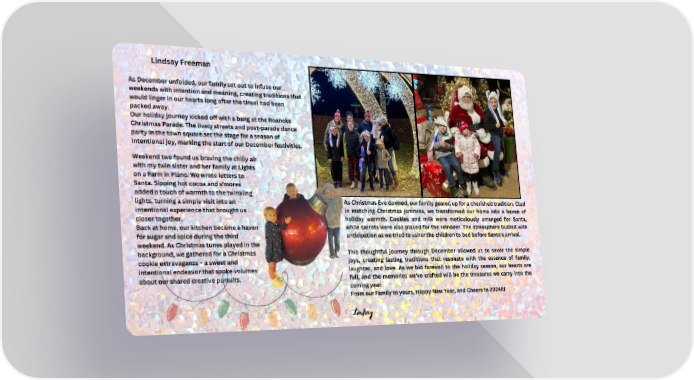 Lindsay Freeman As December unfolded, our family set out to infuse our weekends with intention and meaning, creating traditions that would linger in our hearts long after the tinsel had been packed away. Our holiday journey kicked off with a bang at the Roanoke Christmas Parade. The lively streets and post-parade dance party in the town square set the stage for a season of intentional joy, marking the start of our December festivities. Weekend two found us braving the chilly air with my twin sister and her family at Lights on a Farm in Plano. We wrote letters to Santa. Sipping hot cocoa and s'mores added a touch of warmth to the twinkling As Christmas Eve dawned, our family geared up for a cherished tradition. Clad lights, turning a simple visit into an in matching Christmas jammies, we transformed our home into a haven of intentional experience that brought us holiday warmth. Cookies and milk were meticulously arranged for Santa, closer together. while carrots were also placed for the reindeer. The atmosphere buzzed with Back at home, our kitchen became a haven anticipation as we tried to usher the children to bed before Santa's arrival. for sugar and spice during the third weekend. As Christmas tunes played in the This thoughtful journey through December allowed us to savor the simple background, we gathered for a Christmas joys, creating lasting traditions that resonate with the essence of family, cookie extravaganza – a sweet and laughter, and love. As we bid farewell to the holiday season, our hearts are intentional endeavor that spoke volumes full, and the memories we've crafted will be the treasures we carry into the about our shared creative pursuits. coming year. From our Family to yours, Happy New Year, and Cheers to 2024!!! Lindsay