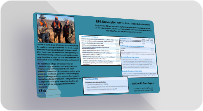 2024 Tax Rates, and Contribution Limits RFG University Every year the IRS and Social Security Administration update tax, rates, schedules, and contribution limits. See the new 2024 numbers below and call us to discuss how they may effect you and your unique circumstances. I do like to think about Christmas when I was young. We would go to my grandparents’ for about a week. Both sets of grandparents lived in the same small West Texas town. We would wake up super early on Christmas morning and run down the stairs to see what Santa had brought us. I can still remember the sound of all those little feet clomping on the stairs! We would have a huge Christmas dinner on Christmas night. We would have a big fire in the fireplace, play Christmas records, and open presents. After dinner, all the cousins and my uncle would play the board game “Risk.” We would play late into the night and have so much fun! It was by far my favorite day of the year. Family traditions are so important, such great memories. Send me an email and tell me about your best Christmas Additional info on Page 4 memories! Chris Sources: IRS and Social Security Administrations updates 2024.
