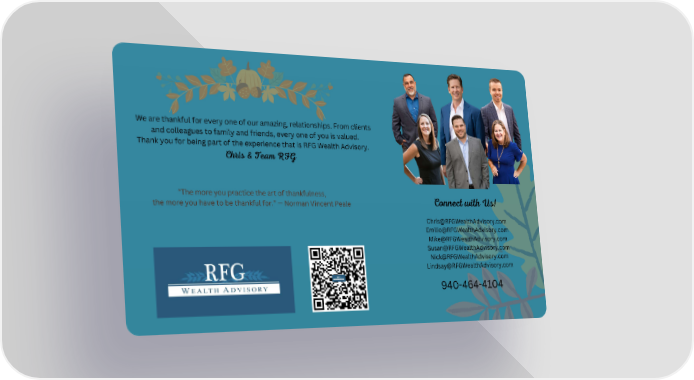 We are thankful for every one of our amazing, relationships. From clients and colleagues to family and friends, every one of you is valued. Thank you for being part of the experience that is RFG Wealth Advisory. Chris & Team RFG “The more you practice the art of thankfulness, Connect with Us! the more you have to be thankful for.” — Norman Vincent Peale [email protected] [email protected] [email protected] [email protected] [email protected] [email protected] 940-464-4104