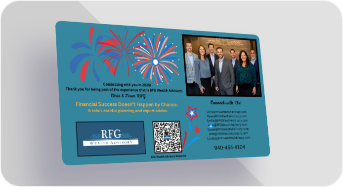 Celebrating with you in 2025! Thank you for being part of the experience that is RFG Wealth Advisory. Chris & Team RFG Connect with Us! [email protected] [email protected] [email protected] [email protected] [email protected] [email protected] [email protected] 940-464-4104 Financial Success Doesn’t Happen by Chance. It takes careful planning and expert advice. RFG Wealth Advisory Blueprint