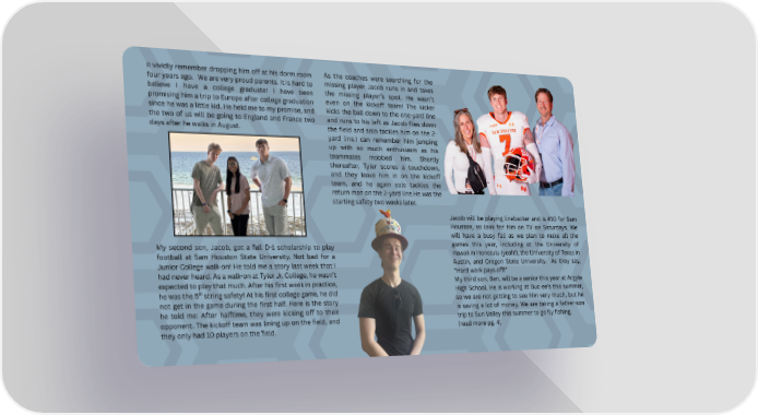 II vividly remember dropping him off at his dorm room four years ago. We are very proud parents. It is hard to believe I have a college graduate! I have been promising him a trip to Europe after college graduation since he was a little kid. He held me to my promise, and the two of us will be going to England and France two days after he walks in August. My second son, Jacob, got a full D-1 scholarship to play football at Sam Houston State University. Not bad for a Junior College walk-on! He told me a story last week that I had never heard. As a walk-on at Tyler Jr. College, he wasn’t expected to play that much. After his first week in practice, he was the 5 string safety! At his first college game, he did not get in the game during the first half. Here is the story he told me: After halftime, they were kicking off to their opponent. The kickoff team was lining up on the field, and they only had 10 players on the field. th Jacob will be playing linebacker and is #10 for Sam Houston, so look for him on TV on Saturdays. We will have a busy fall as we plan to make all the games this year, including at the University of Hawaii in Honolulu (yeah!), the University of Texas in Austin, and Oregon State University. As they say, “Hard work pays off!” My third son, Ben, will be a senior this year at Argyle High School. He is working at Buc-ee’s this summer, so we are not getting to see him very much, but he is saving a lot of money. We are taking a father-son trip to Sun Valley this summer to go fly fishing. (read more pg. 4) As the coaches were searching for the missing player Jacob runs in and takes the missing player’s spot. He wasn’t even on the kickoff team! The kicker kicks the ball down to the one-yard line and runs to his left as Jacob flies down the field and solo tackles him on the 2- yard line.I can remember him jumping up with so much enthusiasm as his teammates mobbed him. Shortly thereafter, Tyler scores a touchdown, and they leave him in on the kickoff team, and he again solo tackles the return man on the 2-yard line.He was the starting safety two weeks later.