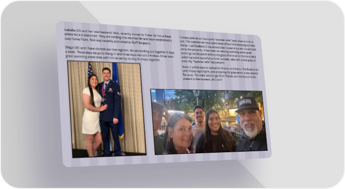 Isabella (25) and her new husband, Nick, recently moved to Tinker Air Force Base, where Nick is stationed. They are settling into married life and have established a cozy home front. Nick was recently promoted to Staff Sergeant. Diego (26) and I have started our new regimen. We are working out together 6 days a week. Three days we go to the gym and three days we ruck 2-4 miles. It has been great spending some time with him as we try to stay in shape together. I always joke about having my “summer wife” back when school is out. This summer we have spent most of our time enjoying our new home. I can’t believe it has almost been a year since we moved back on to the property. It has been so relaxing spending some quiet evenings on the porch with a nice glass of wine or on the back deck watching some beautiful summer sunsets…also with a nice glass of wine. My “Summer wife” likes wine!!!! Soon, it will be back to school for Sharon and Mateo. The final senior year, Friday night lights, and preparing for graduation, a new season for us all. The main advice I get from friends and mentors is to be present in the moment…Will do!!!!