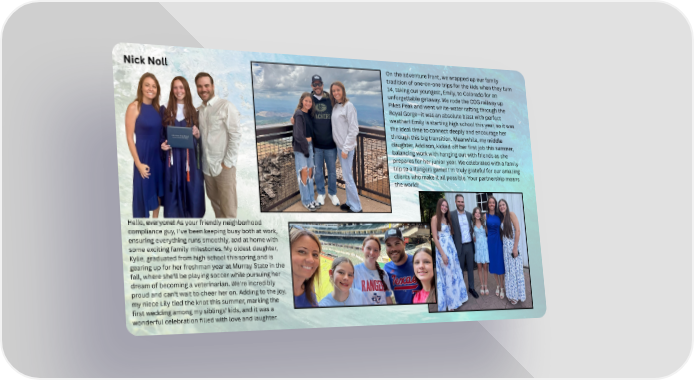 Nick Noll Hello, everyone! As your friendly neighborhood compliance guy, I've been keeping busy both at work, ensuring everything runs smoothly, and at home with some exciting family milestones. My oldest daughter, Kylie, graduated from high school this spring and is gearing up for her freshman year at Murray State in the fall, where she'll be playing soccer while pursuing her dream of becoming a veterinarian. We're incredibly proud and can't wait to cheer her on. Adding to the joy, my niece Lily tied the knot this summer, marking the first wedding among my siblings' kids, and it was a wonderful celebration filled with love and laughter. On the adventure front, we wrapped up our family tradition of one-on-one trips for the kids when they turn 14, taking our youngest, Emily, to Colorado for an unforgettable getaway. We rode the COG railway up Pikes Peak and went white-water rafting through the Royal Gorgeāit was an absolute blast with perfect weather! Emily is starting high school this year, so it was the ideal time to connect deeply and encourage her through this big transition. Meanwhile, my middle daughter, Addison, kicked off her first job this summer, balancing work with hanging out with friends as she prepares for her junior year. We celebrated with a family trip to a Rangers game! I'm truly grateful for our amazing clients who make it all possible. Your partnership means the world!