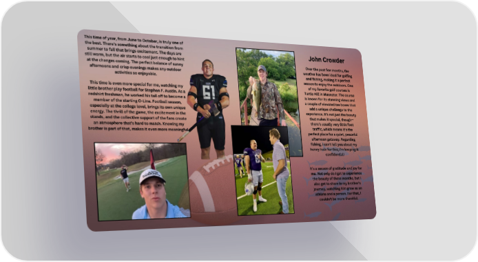 This time of year, from June to October, is truly one of the best. There's something about the transition from John Crowder John Crowder summer to fall that brings excitement. The days are still warm, but the air starts to cool just enough to hint Over the past few months, the at the changes coming. The perfect balance of sunny weather has been ideal for golfing afternoons and crisp evenings makes any outdoor and fishing, making it a perfect activities so enjoyable. season to enjoy the outdoors. One of my favorite golf courses is This time is even more special for me, watching my Turtle Hill in Muenster. The course little brother play football for Stephen F. Austin. As a is known for its stunning views and redshirt freshman, he worked his tail off to become a a couple of elevated tee boxes that member of the starting O-Line. Football season, add a unique challenge to the especially at the college level, brings its own unique experience. It's not just the beauty energy. The thrill of the game, the excitement in the that makes it special, though— stands, and the collective support of the fans create there's usually very little foot an atmosphere that's hard to match. Knowing my traffic, which means it's the brother is part of that, makes it even more meaningful. perfect place for a quiet, peaceful afternoon getaway. Regarding fishing, I can't tell you about my honey hole for this; I'm keeping it confidential! It's a season of gratitude and joy for me. Not only do I get to experience the beauty of these months, but I also get to share in my brother's journey, watching him grow as an athlete and a person. For that, I couldn't be more thankful.