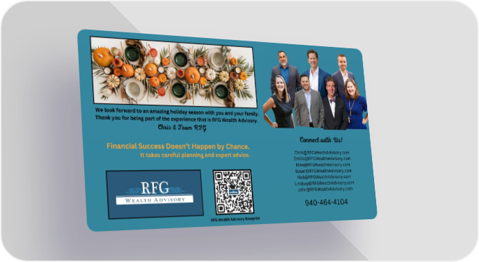 We look forward to an amazing holiday season with you and your family. Thank you for being part of the experience that is RFG Wealth Advisory. Chris & Team RFG Connect with Us! Financial Success Doesn’t Happen by Chance. [email protected] It takes careful planning and expert advice. [email protected] [email protected] [email protected] [email protected] [email protected] [email protected] 940-464-4104 RFG Wealth Advisory Blueprint