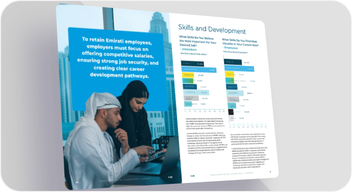 To retain Emirati employees, employers must focus on offering competitive salaries, ensuring strong job security, and creating clear career development pathways. M A K I N G E M I R AT I S AT I O N A S U C C E S S 2 0 2 5 - G U I D E B O O K 5 0 What Skills Do You Believe Are Most Important For Your Desired Job? - Jobseekers *MULTIPLE SELECTION APPLY* Communication remains the most valued skill among UAE National job seekers who responded to the survey, with 70.69% emphasizing its importance. This marks a slight decrease from last year’s 77.8%, but it continues to be the most sought-after competency. IT skills (45.78%) have also maintained their relevance, though at a lower rate than last year’s 60.86%, reflecting potential shifts in industry demands. Leadership (51.73%) and analytics (27.65%) are emerging as key skills, indicating a growing interest in management and data-driven roles. Meanwhile, creative design (29.73%) and marketing (23.56%) have gained traction, suggesting that job seekers are recognizing the value of creative and strategic thinking in their career paths. Skills and Development 0 1 0 2 0 3 0 4 0 5 0 6 0 7 0 8 0 I T S K I L L S C O M M U N I C AT I O N AC C O U N T I N G & F I N A N C E A N A LY T I C S L E A D E R S H I P C R E AT I V E D E S I G N E N G I N E E R I N G M A R K E T I N G 4 5 . 7 8 % 2 3 . 5 6 % 1 4 . 9 1 % 2 7. 6 5 % 5 1 . 7 3 % 2 9 . 7 3 % 2 1 . 5 4 % 7 0 . 6 9 % What Skills Do You Find Most Valuable In Your Current Role? - Employees *MULTIPLE SELECTION APPLY* Communication remains the most valued skill among UAE National employees who responded to the survey, with 65.35% rating it as essential in their current roles. While this is slightly lower than last year’s 66.78%, it continues to be the most in-demand competency. IT skills (38.93%) have seen a decline from last year’s 45%, reflecting potential shifts in workplace requirements. Leadership skills (36.84%) have gained importance compared to last year’s 30.64%, indicating a growing focus on managerial and decision-making abilities. Additionally, analytics (24.08%) and project management (25.95%) are emerging as key skills, suggesting an increasing emphasis on data-driven insights and structured execution within organisations. 0 1 0 2 0 3 0 4 0 5 0 6 0 7 0 8 0 C O M M U N I C AT I O N AC C O U N T I N G & F I N A N C E A N A LY T I C S L E A D E R S H I P PROJECT MANAGEMENT CREATIVE DESIGN E N G I N E E R I N G OT H E R I T S K I L L S M A R K E T I N G 3 8 . 9 3 % 1 9 . 5 9 % 1 7. 9 8 % 2 4 . 0 8 % 1 7. 8 7 % 1 0 .1 1 % 2 5 . 9 5 % 1 0 . 8 4 % 3 6 . 8 4 % 6 5 . 3 5 % M A K I N G E M I R AT I S AT I O N A S U C C E S S 2 0 2 5 - G U I D E B O O K 5 1