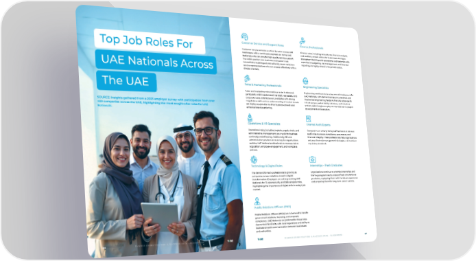 Top Job Roles For UAE Nationals Across The UAE M A K I N G E M I R AT I S AT I O N A S U C C E S S 2 0 2 5 - G U I D E B O O K 6 6 SOURCE: Insights gathered from a 2025 employer survey with participation from over 450 companies across the UAE, highlighting the most sought-after roles for UAE Nationals. Customer Service and Support Roles Customer service remains a critical function across UAE businesses, with a continued emphasis on hiring UAE Nationals who can provide high-quality service support. The UAE’s position as a business and tourism hub necessitates multilingual and culturally aware customer service representatives who can engage effectively with a diverse clientele. Sales & Marketing Professionals Sales and marketing roles continue to be in demand, particularly within sectors such as retail, real estate, and corporate sales. UAE National candidates with strong negotiation skills and an understanding of market trends are highly sought after to drive business growth and enhance brand positioning. Operations & HR Specialists Operational roles, including logistics, supply chain, and administrative management, are crucial for business continuity and efficiency. Additionally, HR and administrative positions remain key for organisations seeking UAE National professionals to manage talent acquisition, employee engagement, and workplace policies. Technology & Digital Roles The demand for tech professionals is growing as companies across industries invest in digital transformation. Employers are actively seeking UAE Nationals for IT, cybersecurity, and data analysis roles, highlighting the importance of digital skills in today’s job market. Public Relations Officers (PRO) Public Relations Officers (PROs) are in demand to handle government relations, licensing, and corporate compliance. UAE Nationals are preferred for these roles due to their familiarity with local regulations and ability to facilitate smooth communication between businesses and authorities. Finance Professionals Finance roles, including accountants, financial analysts, and auditors, remain critical for businesses aiming to strengthen their financial operations. UAE Nationals with expertise in budgeting, risk management, and financial reporting are highly valued in the private sector. Engineering Specialists Engineering continues to be a key area of employment for UAE Nationals, with demand across civil, electrical, and mechanical engineering fields. As the UAE advances its infrastructure, sustainability initiatives, and industrial sectors, skilled engineers play an essential role in project development and execution. Internal Audit Experts Companies are actively hiring UAE Nationals in internal audit roles to ensure compliance, governance, and financial integrity. These professionals help organisations enhance their risk management strategies and maintain regulatory standards. Internships – Fresh Graduates Organisations continue to prioritise internships and training programmes to onboard fresh UAE National graduates, equipping them with hands-on experience and preparing them for long-term career success. M A K I N G E M I R AT I S AT I O N A S U C C E S S 2 0 2 5 - G U I D E B O O K 6 7