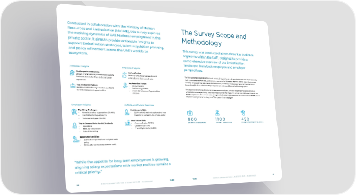 Jobseeker Insights Challenges in Finding Jobs 59.05% of UAE National jobseekers struggle to find roles that match their skills and career aspirations. Top Job Search Platform 55.95% of UAE National jobseekers use NAFIS to find employment opportunities. Employee Insights Job Satisfaction 56.94% of UAE Nationals report overall satisfaction in their current roles. Key Retention Factors • Salary (45.55%) • Job Security (42.91%) • Career Development Opportunities (37.22%) Employer Insights Top Hiring Challenges • Unrealistic salary expectations (50.48%) • Candidate shortages (28.47%) • Technical skill gaps (13.40%) Top In-Demand Roles for UAE Nationals • Operations • HR & Administration • Sales & Marketing Remote Work Policies • 52.51% of companies have no hybrid work policy. • 30.11% offer full flexibility (remote work). AI, Skills, and Future Readiness Confidence in Skills • 82.97% of UAE Nationals believe they have the skills to succeed in the private sector. Most Valued Skills • Communication (70.78%) • Leadership (51.73%) • IT and Digital Skills (45.88%) “While the appetite for long-term employment is growing, aligning salary expectations with market realities remains a critical priority.” Conducted in collaboration with the Ministry of Human Resources and Emiratisation (MoHRE), this survey explores the evolving dynamics of UAE National employment in the private sector. It aims to provide actionable insights to support Emiratisation strategies, talent acquisition planning, and policy refinement across the UAE's workforce ecosystem. M A K I N G E M I R AT I S AT I O N A S U C C E S S 2 0 2 5 - G U I D E B O O K 2 0 This survey was conducted across three key audience segments within the UAE, designed to provide a comprehensive overview of the Emiratisation landscape from both employee and employer perspectives. The first segment targeted UAE Nationals across all seven Emirates. Respondents were first asked to identify their current employment status, allowing the survey to be bifurcated into two distinct respondent groups: currently employed UAE Nationals and UAE National jobseekers. This approach ensured the collection of focused insights that reflect the unique experiences and expectations of both demographics. The second segment was directed at private-sector employers, with the objective of understanding their Emiratisation strategies, hiring practices, and perceived challenges. The survey was distributed via email and SMS to a representative sample across all segments. In total, 2,000 responses were received from UAE National employees and jobseekers, alongside 450 responses from employers The Survey Scope and Methodology 9 0 0 E M I R AT I J O B S E E K E R S 1 1 0 0 E M I R AT I E M P LOY E E S 4 5 0 P R I VAT E S E C T O R E M P LOY E R S M A K I N G E M I R AT I S AT I O N A S U C C E S S 2 0 2 5 - G U I D E B O O K 2 1