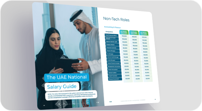 The UAE National Salary Guide M A K I N G E M I R AT I S AT I O N A S U C C E S S 2 0 2 5 - G U I D E B O O K 6 8 NOTE: The salary data presented in this guide is derived from TASC's internal records, encompassing TASC’s experience with hiring UAE National professionals and the compensation packages offered by competitors within the industry. Accounting & Finance 140,000 130,000 120,000 100,000 80,000 70,000 60,000 70,000 60,000 40,000 25,000 25,000 25,000 25,000 20,000 Designation 180,000 135,000 125,000 150,000 90,000 75,000 70,000 80,000 65,000 50,000 30,000 30,000 30,000 30,000 22,000 220,000 140,000 130,000 120,000 100,000 80,000 80,000 90,000 70,000 60,000 35,000 35,000 35,000 35,000 25,000 Chief Financial Officer Chief Internal Audit Director Head of Internal Audit Finance Director Financial Controller Finance Manager Tax Manager Internal Audit Manager Credit Manager Senior Financial Analyst Management Accountant Senior Accountant Internal Auditor Credit Controller General Accountant Non-Tech Roles M A K I N G E M I R AT I S AT I O N A S U C C E S S 2 0 2 5 - G U I D E B O O K 6 9 Min Monthly Salary (AED) Avg Monthly Salary (AED) Max Monthly Salary (AED)