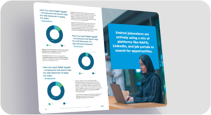 Have You Used ‘Falek Tayyeb’ – An Exclusive Job Search App For UAE Nationals To Apply For Jobs? - Jobseekers Have You Used ‘Falek Tayyeb’ – An Exclusive Job Search App For UAE Nationals To Apply For Jobs? – Employees Engagement with the ‘Falek Tayyeb’ app among UAE National employees has seen a slight improvement, with 16.01% of respondents indicating they have used the platform compared to just 4% last year. This growth suggests increasing awareness and adoption of the app as a resource for career opportunities. However, the majority (83.99%) have yet to explore the platform, signaling room for further outreach and promotion. As the app continues to evolve, efforts to enhance visibility and integration with employer recruitment strategies may encourage more UAE National employees to leverage it for career advancement. Adoption of the Falek Tayyeb app among UAE National jobseekers remains relatively low, with only 15.34% reporting they have used the platform. A significant 84.66% have yet to engage with it, highlighting a clear opportunity to boost awareness, visibility, and integration with job search strategies to better serve Emirati jobseekers. Y E S N O 84.66% 8 . 3 7 % 1 5 . 3 4 % Y E S N O 83.99% 8 . 3 7 % 1 6 . 0 1 % M A K I N G E M I R AT I S AT I O N A S U C C E S S 2 0 2 5 - G U I D E B O O K 3 2 Have You Used ‘Falek Tayyeb’ – An Exclusive Job Search App For UAE Nationals, For Recruitment Purposes? - Employers Employer adoption of the ‘Falek Tayyeb’ app for recruitment purposes remains limited, with 6.51% of private sector employers indicating they have used the platform — only a slight increase from last year’s 6.25%. While the platform is still in its early stages, this minimal growth suggests that further awareness and engagement efforts may be needed to encourage wider adoption among businesses. With 93.49% of employers yet to utilise the app, there is a significant opportunity to promote its benefits as a dedicated hiring tool for Emirati talent. Y E S N O 93.49% 8 . 3 7 % 6 . 5 1 % Emirati jobseekers are actively using a mix of platforms like NAFIS, LinkedIn, and job portals to search for opportunities. M A K I N G E M I R AT I S AT I O N A S U C C E S S 2 0 2 5 - G U I D E B O O K 3 3