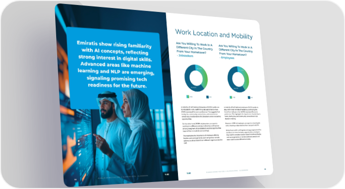 Emiratis show rising familiarity with AI concepts, reflecting strong interest in digital skills. Advanced areas like machine learning and NLP are emerging, signaling promising tech readiness for the future. M A K I N G E M I R AT I S AT I O N A S U C C E S S 2 0 2 5 - G U I D E B O O K 3 8 Work Location and Mobility Are You Willing To Work In A Different City In The Country From Your Hometown? - Jobseekers Are You Willing To Work In A Different City In The Country From Your Hometown? - Employees A majority of UAE National employees (58.91%) prefer to stay within their emirate of residence, continuing the trend from last year when 53.73% expressed the same preference. This highlights the importance of proximity to home, family ties, and community connections in job decision-making. However, 41.09% of employees are open to relocating for work, showing a slight decline from last year’s 46.27%. While there is still a willingness among a segment of the workforce to move for better opportunities, employers may need to consider location-based incentives, flexible work arrangements, or remote options to attract and retain talent across different emirates. A majority of UAE National jobseekers (60.62%) prefer not to relocate for work, reaffirming last year’s trend where 57.31% expressed the same preference. This suggests that family ties, community connections, and convenience remain key considerations for jobseekers when evaluating opportunities. On the other hand, 39.38% of jobseekers are open to working in a different emirate, indicating a willingness among a segment of candidates to explore opportunities beyond their immediate surroundings. This highlights the importance of employers offering flexible work arrangements, such as hybrid or remote options, to attract talent from different regions across the UAE. Y E S N O 60.62% 8 . 3 7 % 3 9 . 3 8 % Y E S N O 58.91% 8 . 3 7 % 4 1 . 0 9 % M A K I N G E M I R AT I S AT I O N A S U C C E S S 2 0 2 5 - G U I D E B O O K 3 9