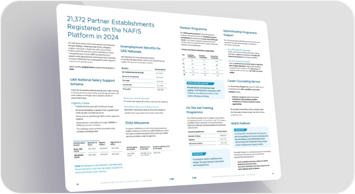 Monthly Salary Band (AED) Allowance Per Child (AED) Maximum Allowance Per Month (AED) Up to AED 50,000 AED 2,400 AED 600 (for up to 4 children) The UAE government continues to advance Emiratisation through strategic initiatives under NAFIS, a flagship program launched in September 2021 as part of the Projects of the 50. Overseen by the UAE National Talent Competitiveness Council, NAFIS provides financial support, skills development, and employment incentives to ensure UAE Nationals are equipped to build long-term careers in the private sector. Below are the updated NAFIS programmes available in 2025: UAE National Salary Support Scheme This scheme supplements the salaries of Emiratis working in the private or financial sector, promoting retention and encouraging sustainable career growth outside of government roles. Eligibility Criteria • Emiratis earning up to AED 30,000 per month • No concurrent salary or pension from a government entity (except inherited pensions) • Salary must be paid through WPS or other approved systems • Active pension contributions through ADRPBF or GPSSA (minimum 2 months) • The employee must not hold ownership in the company of employment Salary Support Amounts Note: Employers must maintain standard pay structures and must not use salary support to reduce Emiratis' base salaries. Unemployment Benefits for UAE Nationals UAE Nationals who lose employment due to circumstances beyond their control may receive financial support for up to six consecutive months. Maximum benefit duration 12 months over 5 years (6 months maximum per instance) Mandatory Job Search Requirement Recipients must actively seek employment; refusal of suitable roles may result in termination of benefits. Child Allowance To support UAE Nationals with child-related expenses, eligible employees earning up to AED 50,000 per month can claim a monthly allowance of AED 600 per child for up to four children under the age of 21. 21,372 Partner Establishments Registered on the NAFIS Platform in 2024 Monthly Salary Bracket Bachelor’s & Above Diploma Holders High School or Below Below AED 20,000 AED 20,000 – 30,000 AED 7,000 AED 3,500 AED 6,000 AED 3,000 AED 5,000 AED 2,500 Recipient Monthly Benefit UAE National who lost their job Spouse (if unemployed) First child Second child Third child AED 7,000 AED 4,500 AED 2,400 AED 2,400 AED 1,600 M A K I N G E M I R AT I S AT I O N A S U C C E S S 2 0 2 5 - G U I D E B O O K 5 6 Pension Programme The NAFIS pension initiative helps UAE Nationals working in the private sector by subsidizing pension contributions for those earning up to AED 20,000 per month. This initiative supports long-term financial security and encourages Emiratis to build sustainable careers in the private sector. Pension Contribution Breakdown (2022-2026): On-The Job Training Programme This initiative provides financial support and hands-on training opportunities in the private sector. The program subsidises trainee salaries for one-year placements, helping Emiratis gain practical experience and develop essential skills. Apprenticeship Programme Support This initiative provides UAE Nationals with practical work experience through apprenticeships in private and semi-public companies. • For UAE National Graduates: Targets university and college graduates, helping them gain professional experience. 432 fresh UAE National participants have already benefited. • For UAE National Students: Open to students from the ninth grade to their final year of higher education, helping them transition smoothly into the workforce. The pilot phase will expand over five years to cover all students in these grades. Career Counselling Service The Career Counselling Service supports UAE Nationals in identifying their skills, capabilities, and career interests through: • Individual and group career assessments • Professional career guidance sessions • Workshops on industry trends and market opportunities This program ensures that Emirati job seekers make informed career choices and align their skills with job market demands. NAFIS Platform The NAFIS Platform is a centralised job portal connecting UAE Nationals with private sector employment opportunities. Since its launch: • 21,372 establishments have utilised the NAFIS platform by the end of 2024. • More than 65,000 jobs have been posted on the NAFIS platform since its launch. Year Employee Contribution Employer Contribution Government Contribution Y1 Y2 Y3 Y4 Y5 0% 0% 0% 0% 0% 0% 2% 4% 5% 6% 20% 18% 16% 15% 14% Educational Qualification Monthly Stipend Bachelor’s & Above Diplomas High School or Below AED 8,000 AED 6,500 AED 4,000 EMPLOYER OBLIGATIONS Private-sector companies must register UAE National employees with GPSSA or an official pension centre within 30 days of hiring. OBJECTIVE To enhance career readiness and bridge the gap between education and employment. OBJECTIVE To streamline recruitment and improve job accessibility for Emirati professionals by providing a centralised job portal connecting UAE Nationals with private sector employment opportunities M A K I N G E M I R AT I S AT I O N A S U C C E S S 2 0 2 5 - G U I D E B O O K 5 7