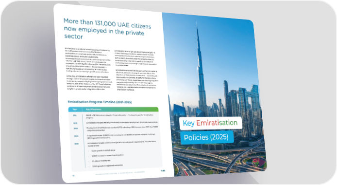 Emiratisation is a national workforce policy introduced by the UAE government to increase UAE National participation in the private sector, reduce reliance on expatriate labour, and build a sustainable, knowledge-based economy. It is a core component of the “We The UAE 2031 Vision,” which aims to double the country's GDP from $405.6 billion to $816.7 billion by 2031. One of the Vision’s four pillars — ‘Forward Society’ — specifically focuses on empowering Emiratis to play leading roles in the country’s growth across all sectors. Since 2022, Emiratisation efforts have been regulated through a set of structured targets and incentive-based frameworks, supported by key national programmes such as NAFIS, part of the 'Projects of the 50'. These initiatives continue to drive employment, skills development, and long-term private sector integration of Emiratis. Emiratisation is no longer just about meeting targets – it is about fostering a workforce equipped with the skills and opportunities to drive national progress. Initiatives such as NAFIS, launched under the 'Projects of the 50,' continue to play a key role in upskilling Emiratis and positioning them in meaningful, high-impact roles within the private sector. Emiratisation ensures that the country’s human capital is effectively utilised in shaping its economic future. The objectives of Emiratisation remain clear — expanding job opportunities for Emiratis, diversifying the labour force, enhancing workforce capabilities, and ensuring long-term economic sustainability. The remarkable progress achieved so far signals that Emiratisation is not just an initiative but a transformative movement shaping the UAE’s future workforce. More than 131,000 UAE citizens now employed in the private sector Emiratisation Progress Timeline (2021-2025) 35,848 UAE Nationals employed in the private sector — the baseline year for Emiratisation progress. Emiratisation targets officially introduced; private sector employment of Emiratis rose to 60,136. Employment of UAE Nationals reached 91,773, reflecting a 156% increase since 2021. Over 19,000 companies onboarded. A significant surge: 131,883 Emiratis employed, and 28,000 companies engaged, marking a 267.8% growth from baseline. Emiratisation targets continue through semi-annual growth requirements. The UAE labour market shows: • 13.23% growth in skilled labour • 20.95% increase in women’s participation • 9% labour mobility rate • 17.02% growth in registered companies 2021 2022 2023 2024 2025 Year Key Milestones M A K I N G E M I R AT I S AT I O N A S U C C E S S 2 0 2 5 - G U I D E B O O K 1 2 Key Emiratisation Policies (2025) M A K I N G E M I R AT I S AT I O N A S U C C E S S 2 0 2 5 - G U I D E B O O K 1 3