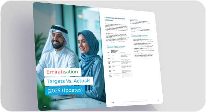 Emiratisation Targets Vs. Actuals (2025 Updates) M A K I N G E M I R AT I S AT I O N A S U C C E S S 2 0 2 5 - G U I D E B O O K 6 2 Emiratisation Progress and Milestones The Emiratisation drive, led by the Ministry of Human Resources and Emiratisation (MoHRE) and supported by NAFIS, continues to yield significant progress, exceeding initial projections and reinforcing the UAE's commitment to integrating UAE Nationals into the private sector workforce. The original target set by the UAE National Human Resources Competitiveness Council (‘NAFIS’) aimed to place 75,000 Emiratis in private sector jobs between 2022 and 2026. This goal has been surpassed ahead of schedule, demonstrating strong employer participation and increasing interest from UAE Nationals in private-sector roles. Progressive Increase in UAE National Employment in the Private Sector 2021 35,848 Baseline year for Emiratisation efforts. 2022 60,136 Early Emiratisation efforts show a strong impact. July 2023 80,000 Employment surged 123.1% compared to 2021. End of 2023 91,773 Historic high – 156% increase since 2021. End of 2024 131,883 Record-breaking growth — 267.8% increase in Emirati employment. Year Number of Emiratis Employed in the Private Sector 2025 Target Further expansion Companies continue hiring 2% annual increase in skilled labor. Key Milestone Current Status As of 1st January 2025, 131,883 UAE Nationals are employed in the private sector – surpassing projections well ahead of schedule. Employer Participation 28,000+ private sector companies now employ UAE Nationals, demonstrating growing commitment from businesses. Progressive Increase in UAE National Employment in the Private Sector • Labour mobility rate in the private sector reached 9% in 2024, indicating a dynamic and evolving workforce. • 99% of private sector workers are now registered under the Wage Protection System (WPS), ensuring transparency and compliance in salary payments. • More than 95% of companies are fully compliant in providing genuine employment opportunities to UAE Nationals. • Since the launch of NAFIS in September 2021, more than 96,000 UAE Nationals have entered private sector employment through the program. M A K I N G E M I R AT I S AT I O N A S U C C E S S 2 0 2 5 - G U I D E B O O K 6 3